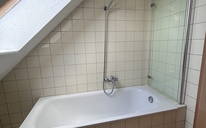 Die Küche ist mit einer funktionalen Einbauküche ausgestattet und liegt etwas abgetrennt vom Wohnbereich, was den Raumcharakter angenehm unterstützt. Das Badezimmer ist gefliest und verfügt über eine Badewanne mit Glasduschwand.