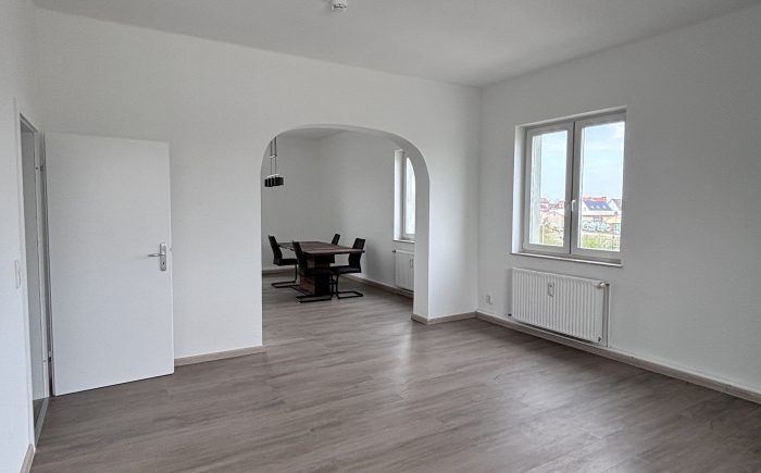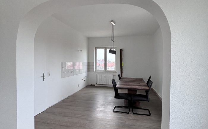 Das Highlight der Wohnung ist der offene Übergang zwischen Wohnzimmer und Küche, die durch einen Bogen in der Wand stilvoll voneinander getrennt und gleichzeitig verbunden sind. Dadurch entsteht ein großzügiger Wohnbereich, der sich ideal als Wohn- und Essbereich nutzen lässt.