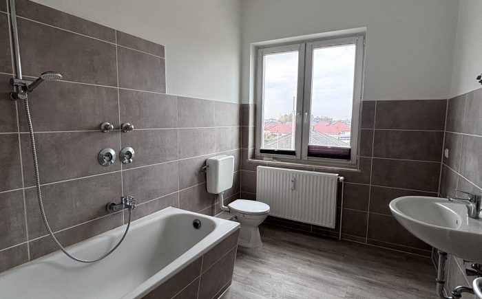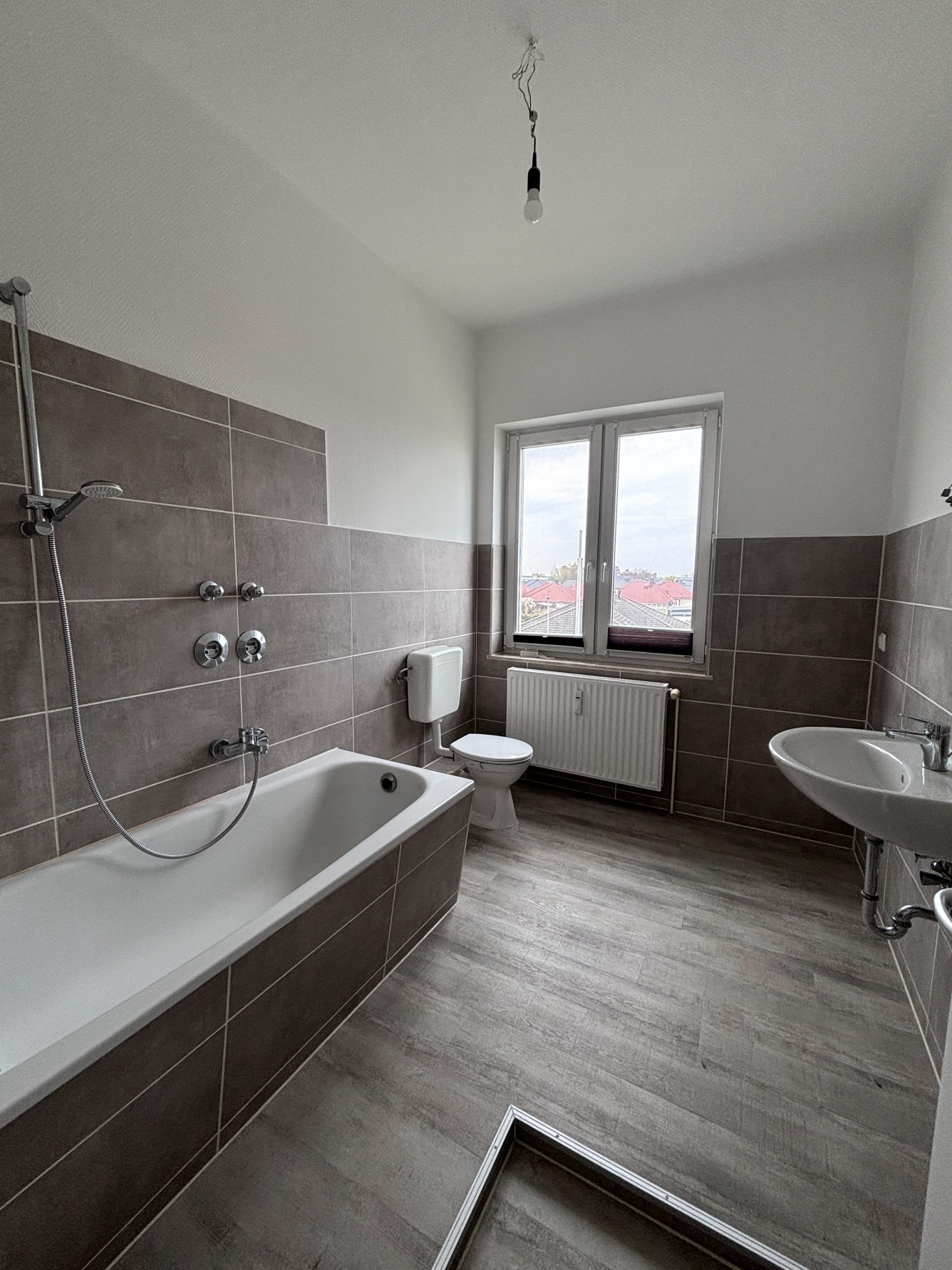 Das Badezimmer ist gefliest, verfügt über ein Fenster und ist mit einer Badewanne ausgestattet.