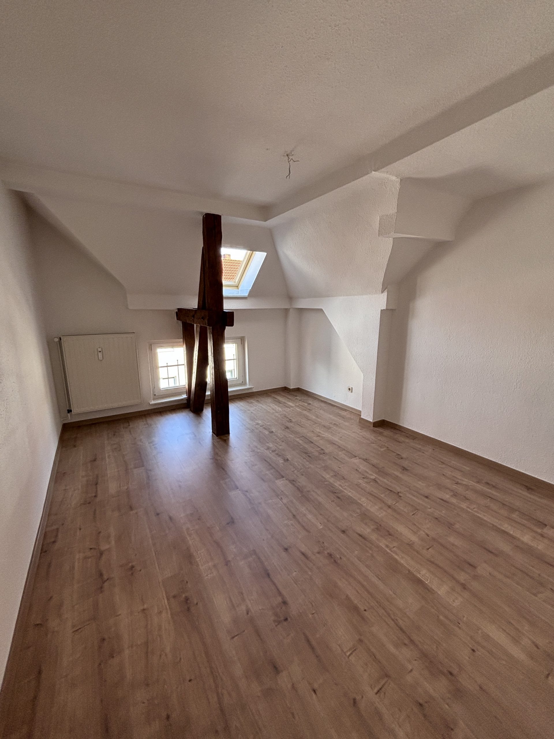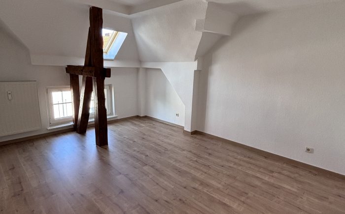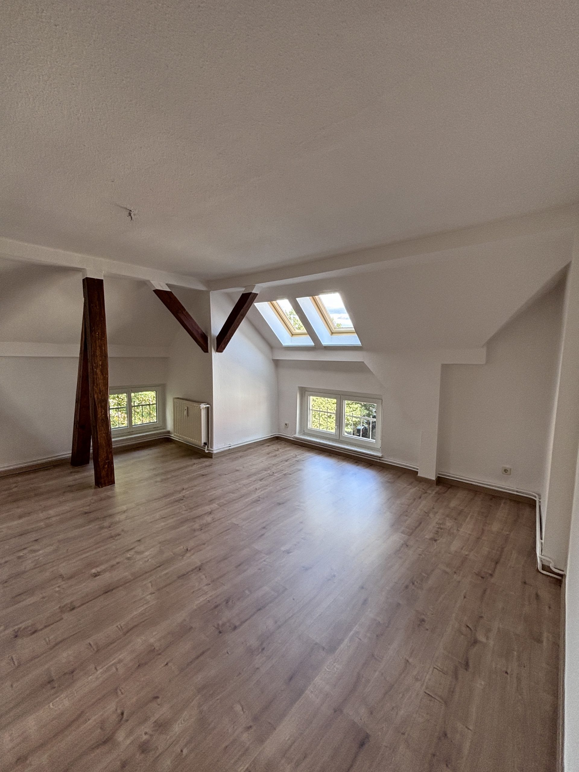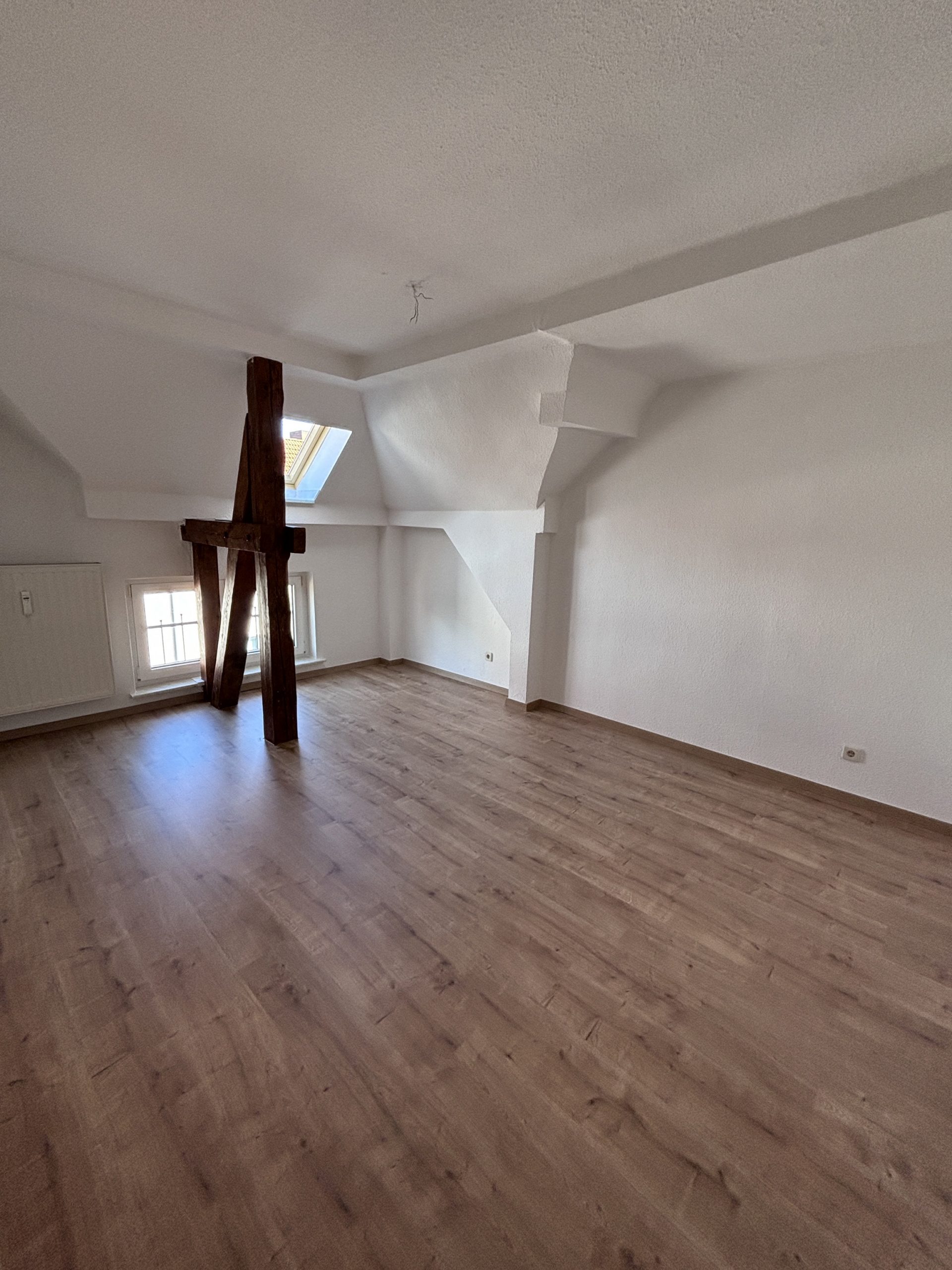 | | 61m² | 2 ZimmerDiese schöne Dachgeschosswohnung überzeugt durch ihren besonderen Charme und eine helle Wohnatmosphäre. Alle Zimmer sind mit neuem Laminatboden ausgestattet und verfügen über sichtbare Balken, die der Wohnung einen gemütlichen Charakter verleihen.