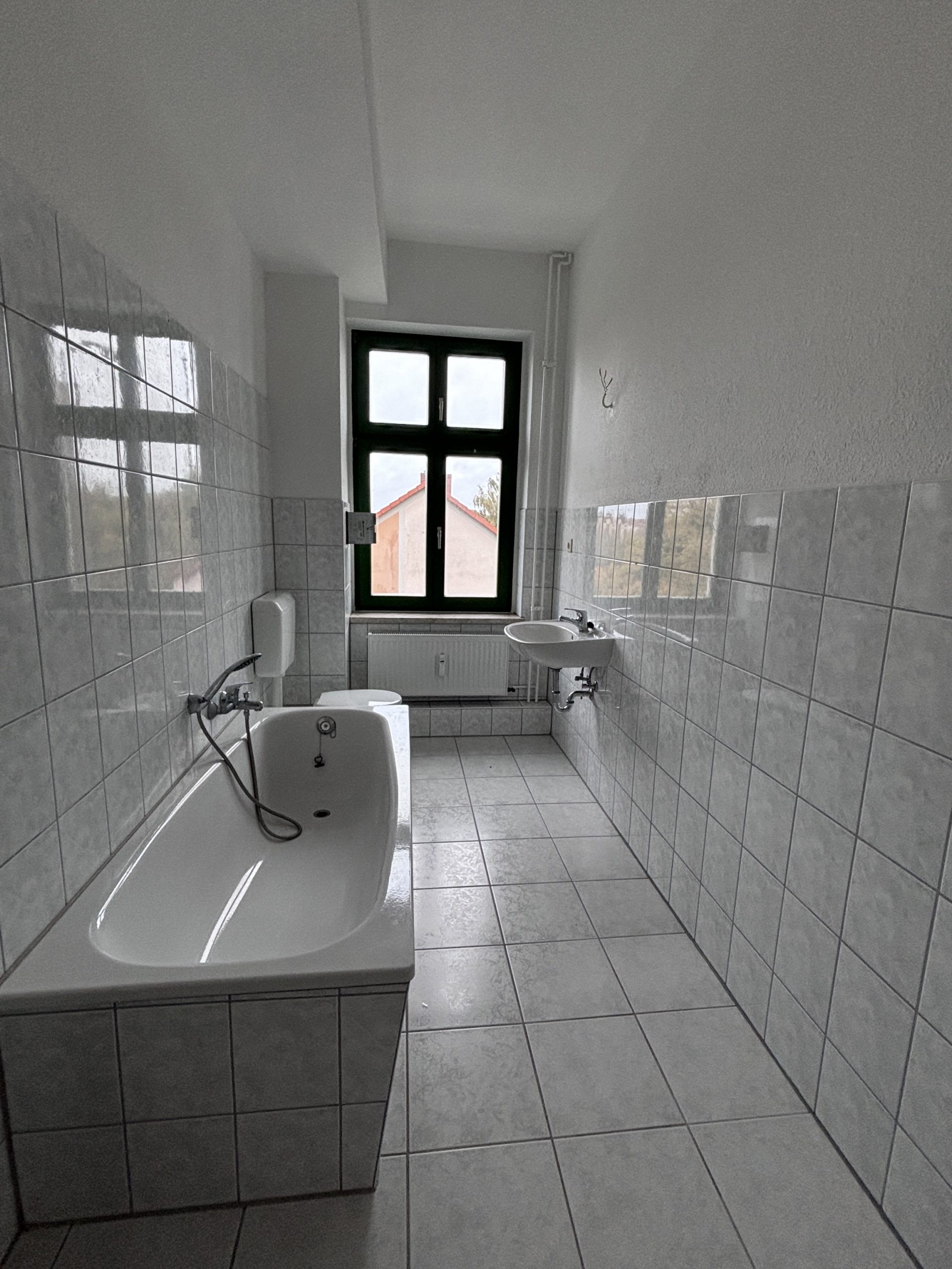 Die Küche ist mit einer modernen Einbauküche ausgestattet und bietet ausreichend Platz zum Kochen und Essen. Das Badezimmer ist hell, vollständig gefliest und verfügt über ein großes Fenster sowie eine Badewanne.