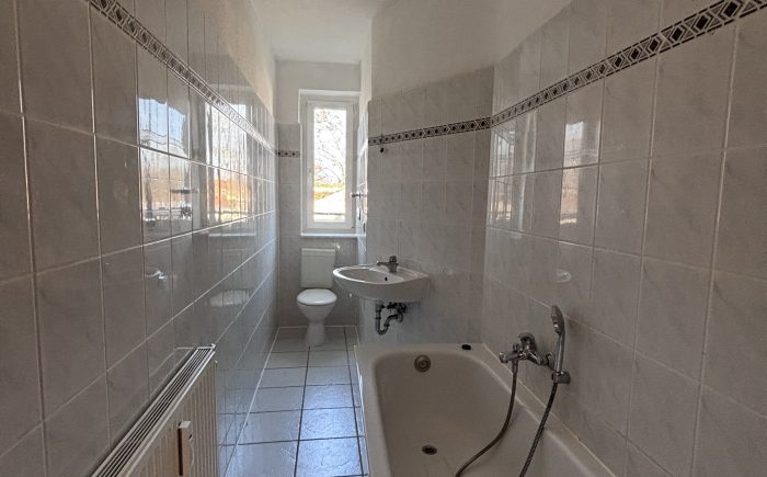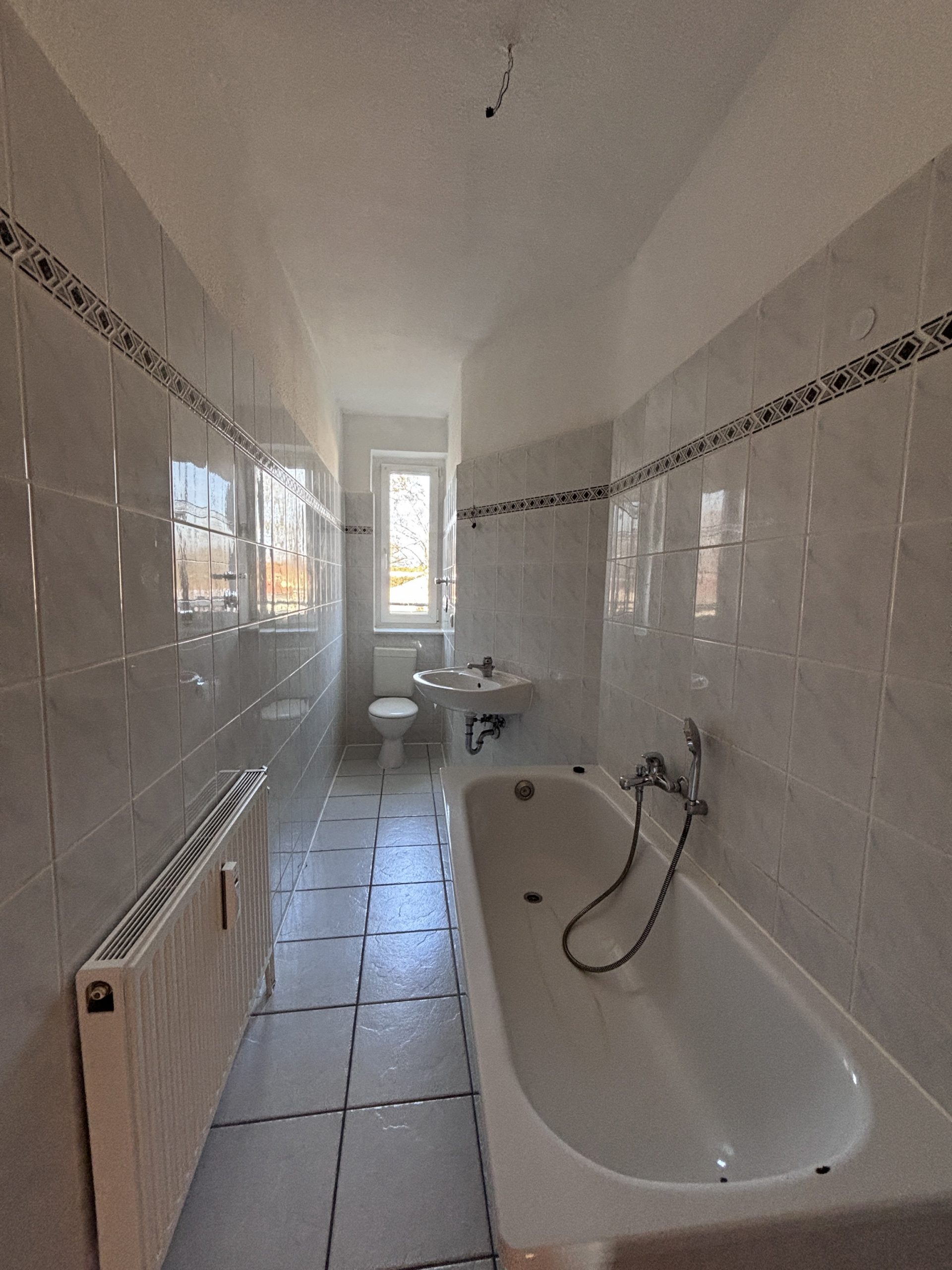Das Badezimmer ist gefliest, verfügt über ein Fenster und ist mit einer Badewanne ausgestattet.